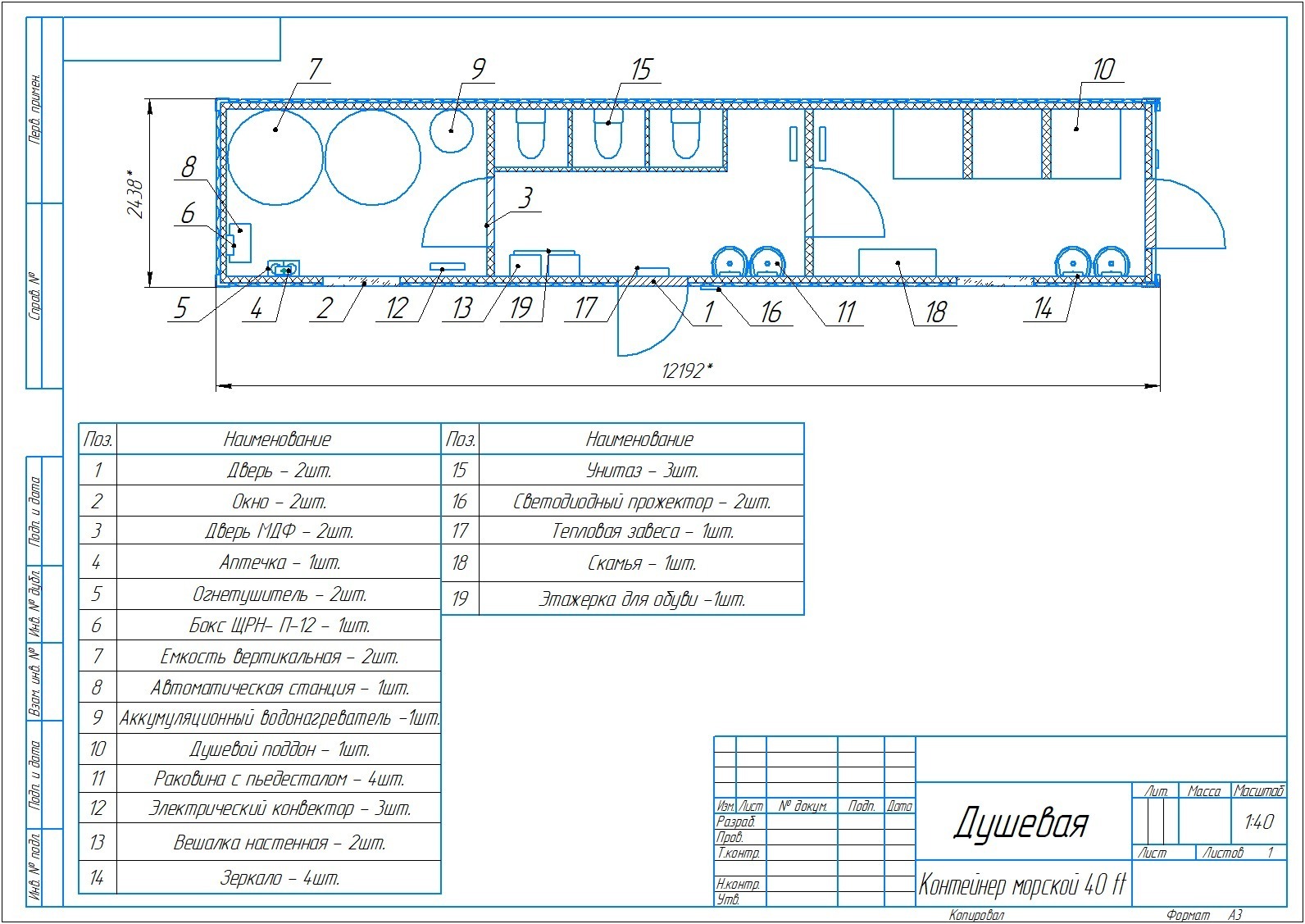 Внутри морского блок-контейнера можно установить любое количество утеплённых перегородок, окон, дверей и т. д. Утепление стен и потолка выполняется с помощью трёхслойных сэндвич-панелей с негорючим утеплителем минеральная вата и PIR. Также предусмотрена проклейка гидроизоляции стен и пола. Такой блок-контейнер пригоден для комфортного использования круглогодично.